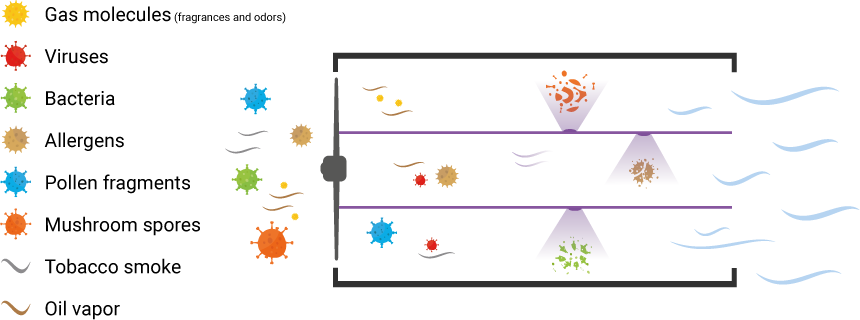 The device works without emitting ozone or producing harmful chemicals and without any filters. Its continuous operation disinfects without harming the environment by emitting harmful substances.